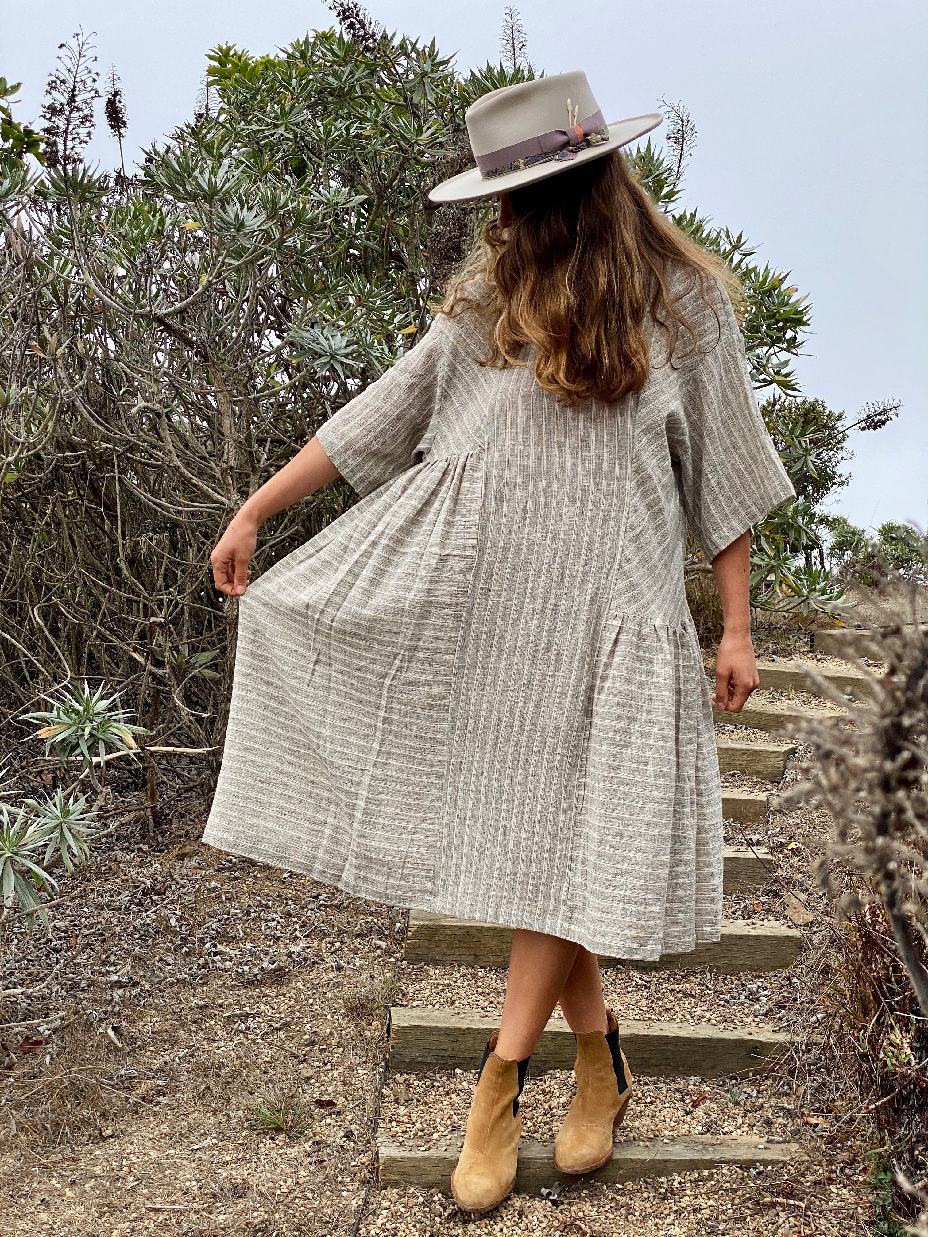 The May Boxy dress has a soft drape that encourages ease and movement. Designed with dropped shoulders, full short sleeves and soft asymmetrical side gathers for a flattering silhouette.