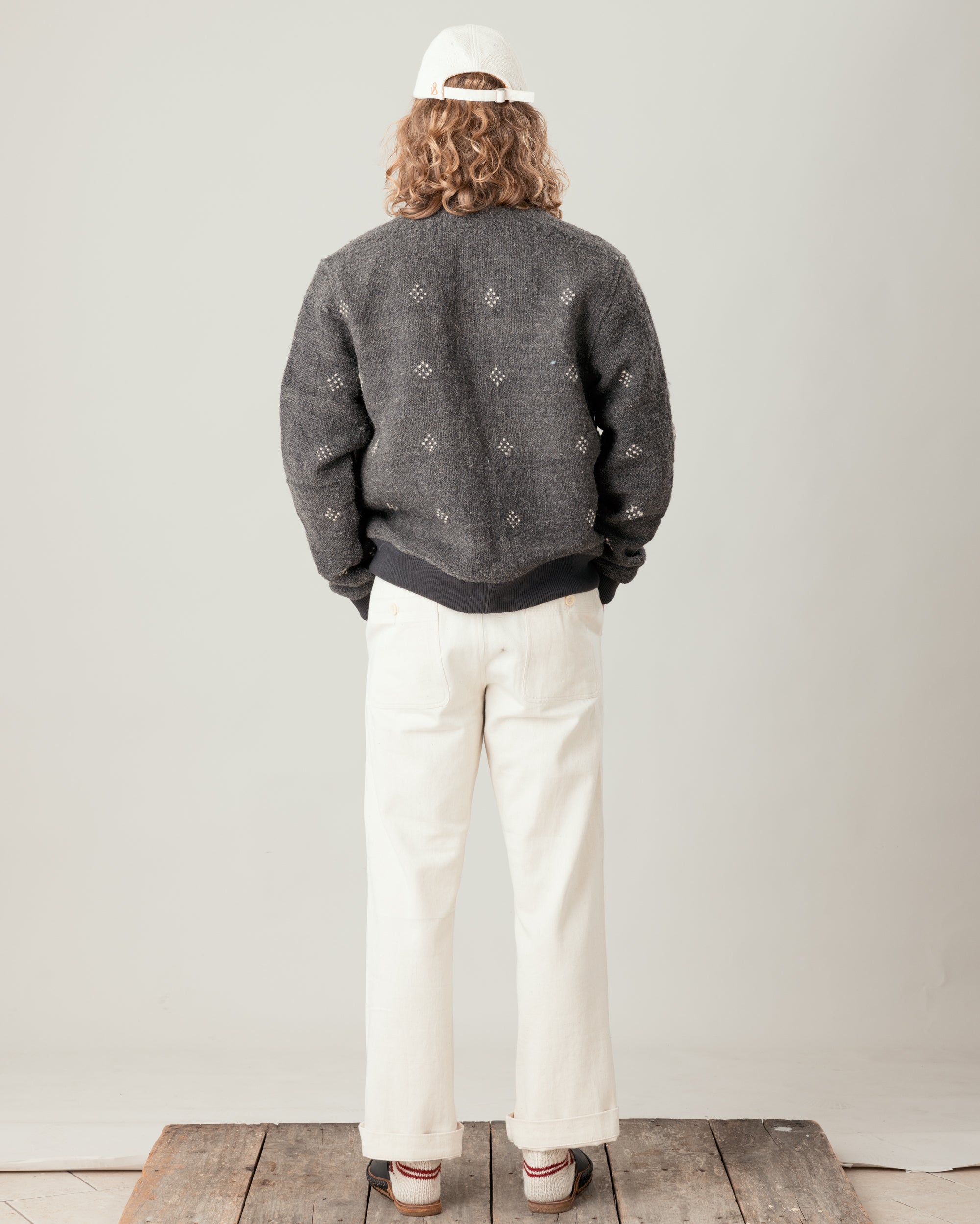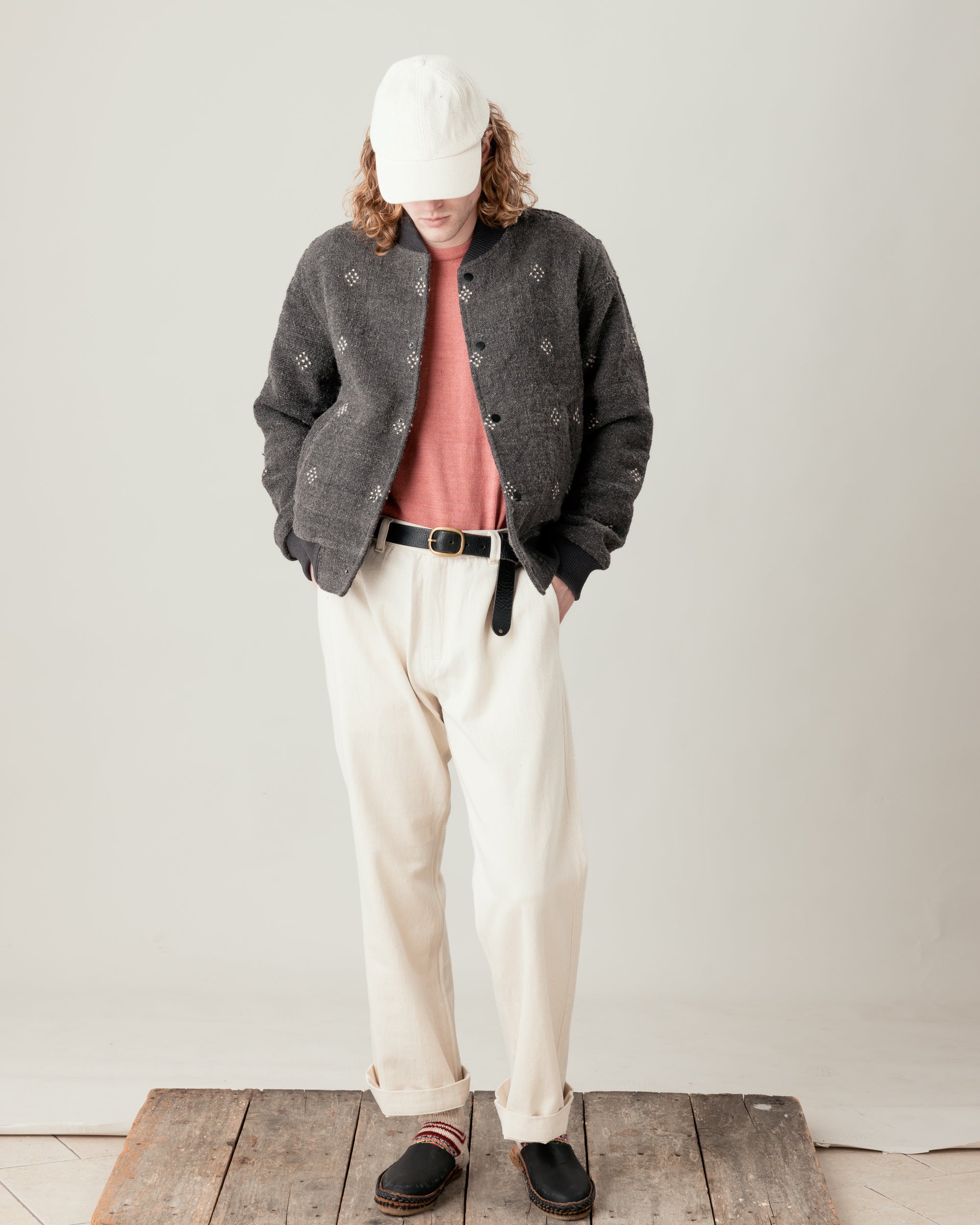 The Langza Varsity Jacket in Charcoal is made in small batches using these traditional techniques and materials.