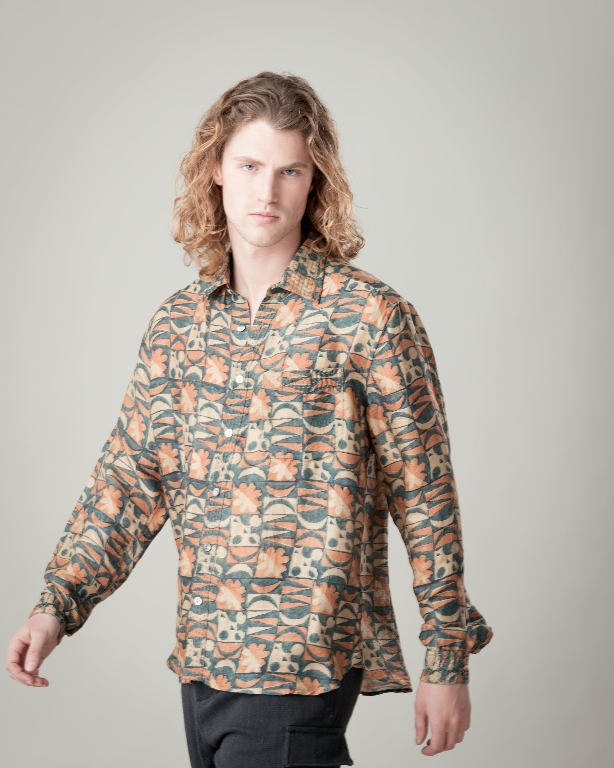 The Neil Shirt is an artful blend of two iconic traditions: Malda Silk Weaving and Kalamkari Block Prints. Originating from Bengal, Malda Silk is known for its smooth texture and lustrous sheen, handwoven on traditional pedal looms. It is paired here with the vibrant patterns of Kalamkari block printing from Machilipatnam in Andhra Pradesh. Crafted from handwoven low-twist Mulberry Malda Silk, this shirt offers luxurious comfort. The tile-pattern design, achieved through traditional Kalamkari block printing, features geometric shapes and motifs inspired by the colonial homes of Mumbai, rendered in an earthy colour palette derived from natural dyes. The silk feels incredibly soft against the skin, while the block-printed surface adds depth and character, making it a sophisticated choice for the modern wardrobe with a touch of heritage and history.