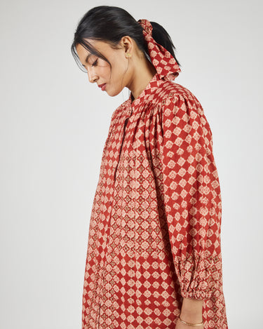 The Samira Tunic in Engineered Tile Print Madder is made in small batches using these traditional techniques and materials.