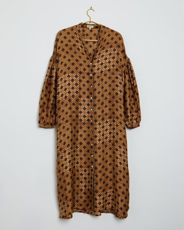 The Mili Silk Dress Brown Multi Print Tile is made in small batches using these traditional techniques and materials.