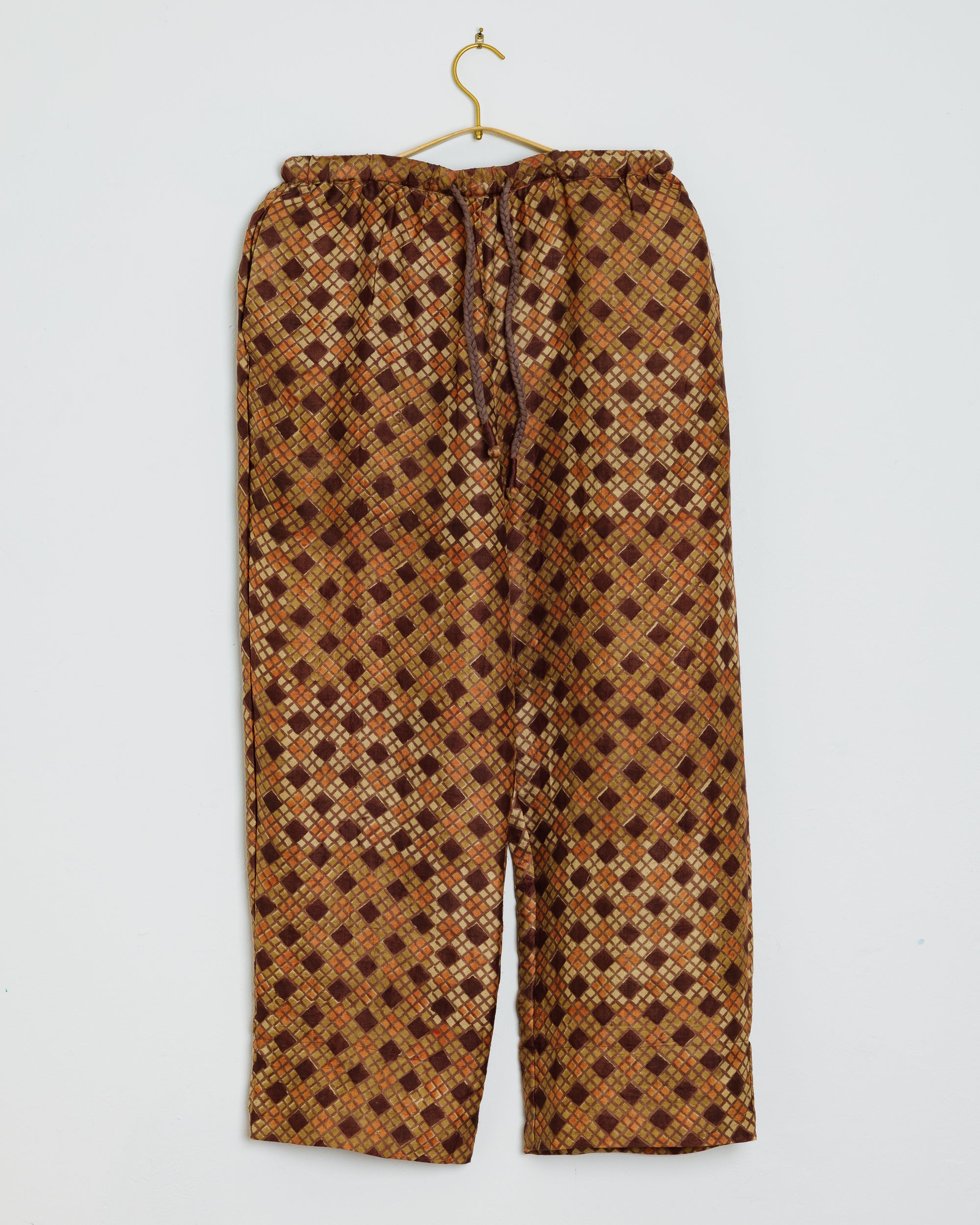 The Garima Pants are a seamless blend of traditional weaving and hand-block printing. Crafted from handwoven Mulberry silk, these pants feature a warm brown base adorned with tile-pattern motifs created using the Kalamkari technique from Machilipatnam, Andhra Pradesh. Teakwood blocks and natural dyes such as indigo and turmeric bring geometric designs inspired by colonial-era architecture, giving the fabric a heritage-rich and timeless appeal. Soft and lightweight, the fabric drapes comfortably while the intricate print adds depth and character, making these pants a versatile addition to any wardrobe.